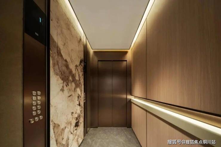 走进电梯,是同样的酒店质感。皮革、岩板、木饰面、金属的艺术运用,让整个轿厢空间质感更强了。