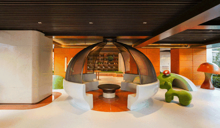 走进园区,是同样松弛、隐逸的园林景观。朴树、榉树、河桦、香橼、红枫、晚樱等各种全冠移植的乔木和特选花灌木,与景石、小品雕塑等交相辉映,让整个园区升腾出一种酒店微度假的氛围感。