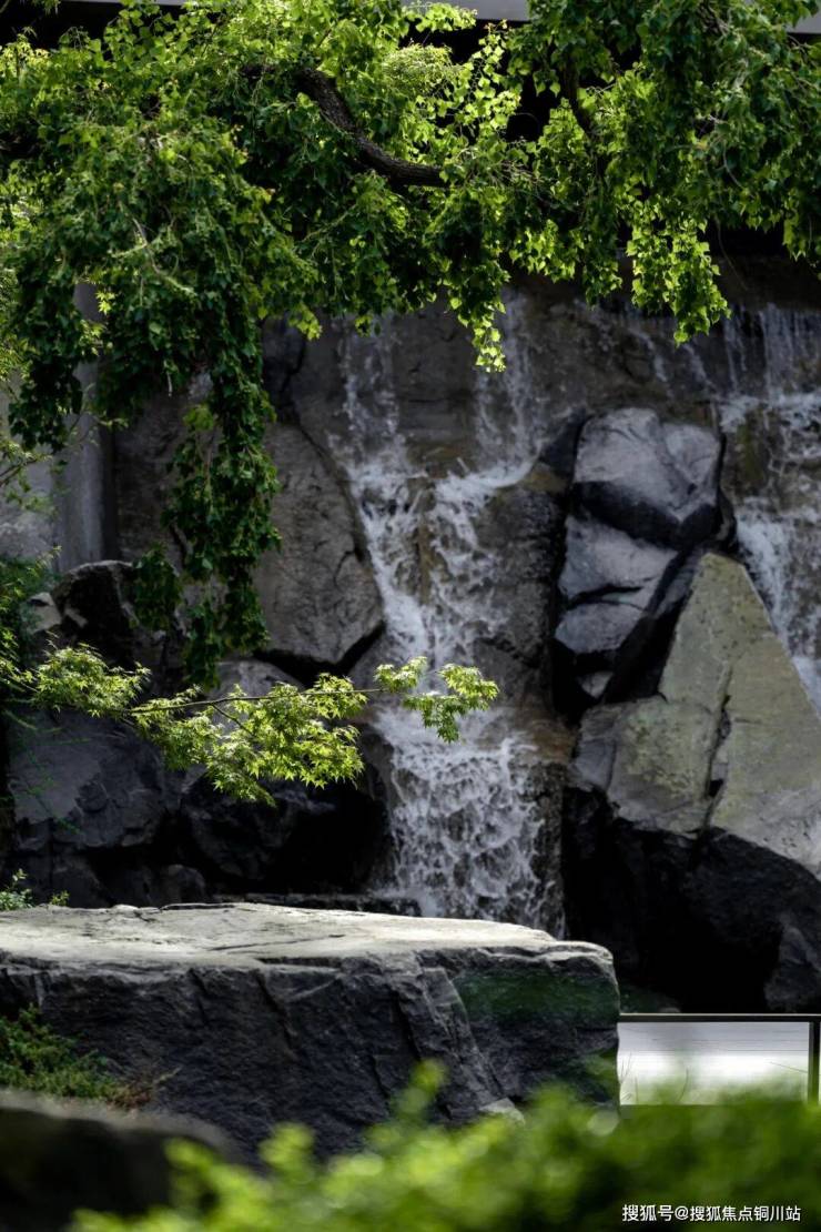 下沉式庭院【三池一山】流水潺潺,草木生机勃勃,青石小路不失为午后散步的好去处。
