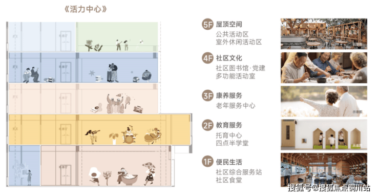 从硬件配置上看,活力中心共分5层,分别涵盖了社区食堂、托育中心、四点半学堂、老年服务中心、社区图书馆、多功能活动室、室外休闲活动区等。