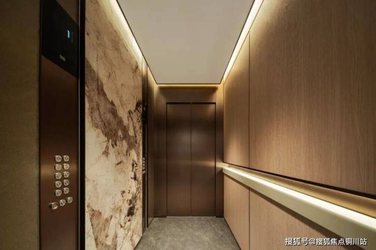 电梯厅内,皮革、木饰面、金属与岩板等多种材质精巧搭配,细节之处无不彰显对品质的苛求。