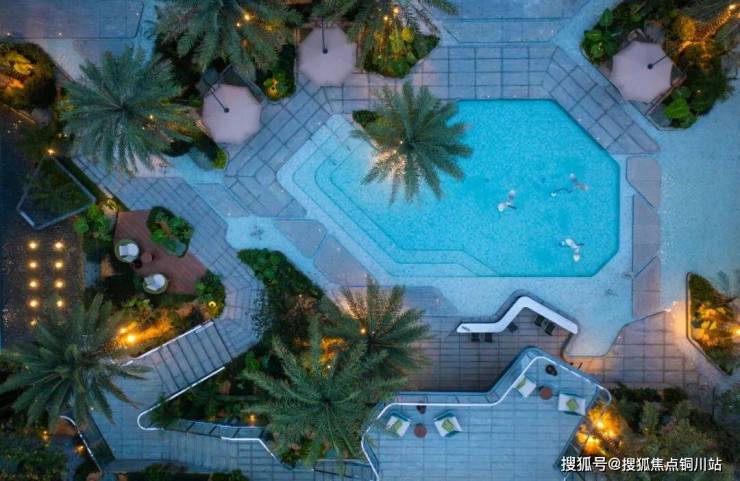 下沉庭院以“漂浮绿洲”为灵感,打造了悬挑错层戏水池,选用热带植物营造度假氛围。