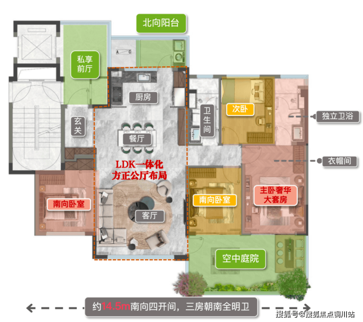 建面约143㎡户型约14.5米南向面宽,在同面积段产品中实属罕见。