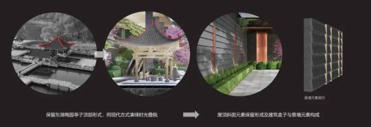 ▲水亭取自东湖梅园的古建形制,而屋顶斜面也成为景墙的构成形式(上:实景图,下:分析图)©UCGD有乘