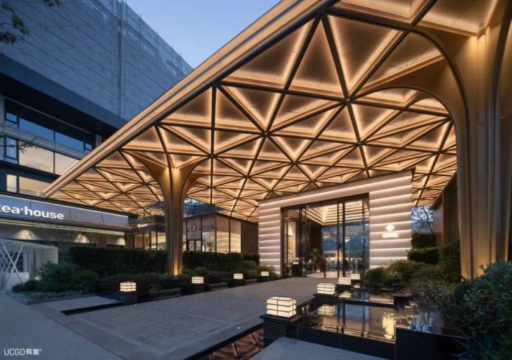 落客大门「檐-厅-庭」的入门动线,提供了从城市烟火到自然宁静的心绪过渡。木构拼花的檐盖被塑造成「林下森系」的超级符号,而步入檐盖之下,树形立柱伫立在森系绿意中,引领着情绪的行进。