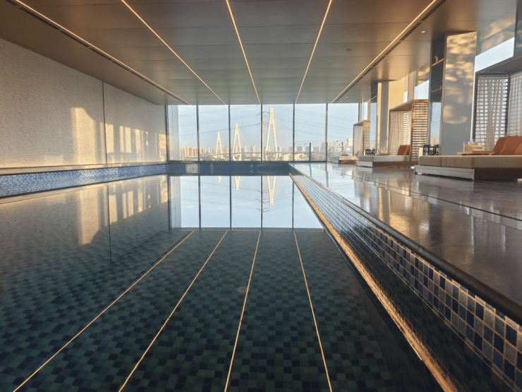绝美双泳池:泳池天花及地面材料延续建筑外部材料,窗边树影艺术屏风与户外空中庭院形成紧密相连,打破室内外的边界,打造户外泳池的体验感。