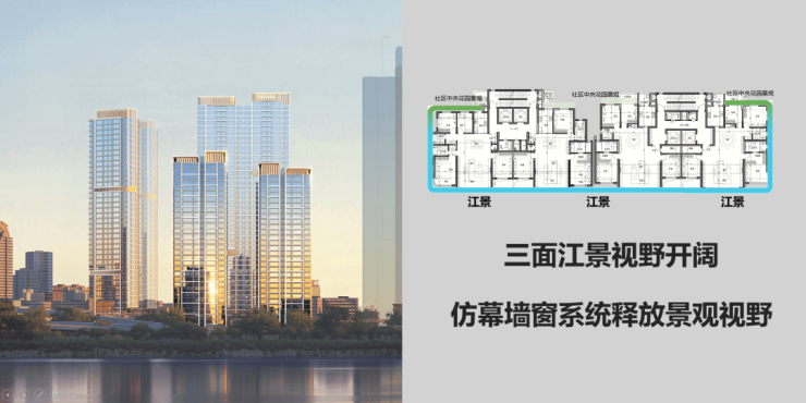 住宅三面江景视野开阔,仿幕墙窗系统释放景观视野,延续沿江界面价值感。