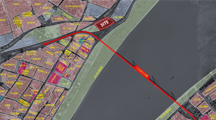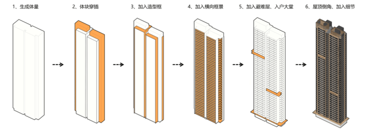 体量生成:建筑强化体量咬合关系,非对称形体切割且倒角处理,以微弧的波浪元素呼应长江文化。