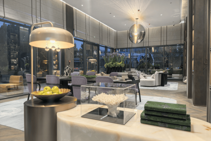 城市玄关:社区大堂场地相对局促,设计团队在有限空间研发出最大的价值感,将社区大堂入口落位稍退于商业界面,用礼序的尺度营造落客区、大堂,最终形成住区玄关空间。
