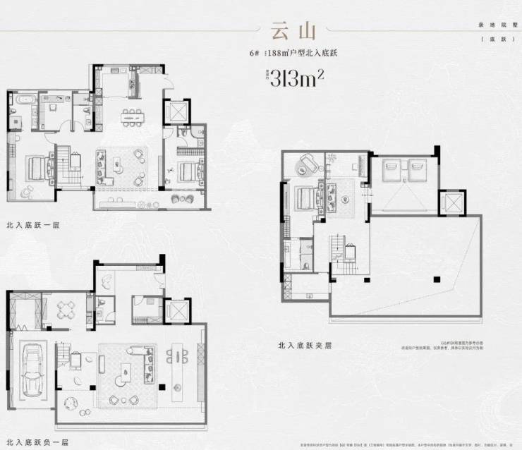 底跃—【私享院墅】户型建面约293㎡、313㎡、383㎡,南北采光最大约270°,地下室大面积光厅,因为地下室计入面积,拉低了单价,大概在4万小几。