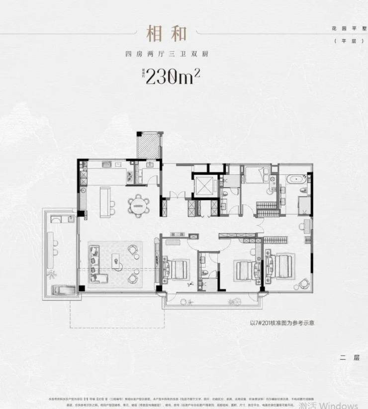 230平四房两厅三卫双厨,南次卧带露台外,客厅西边还有一个大露台,加之大横厅和圆桌,奢享级更上一层。