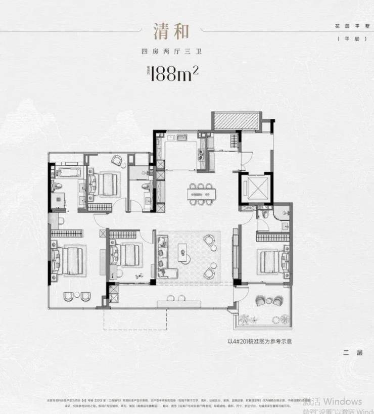 188平四房两厅三卫,更像是169平plus版,露台位置连通另一个南次卧,南主卧卫生间做了双台盆,舒适度更高。