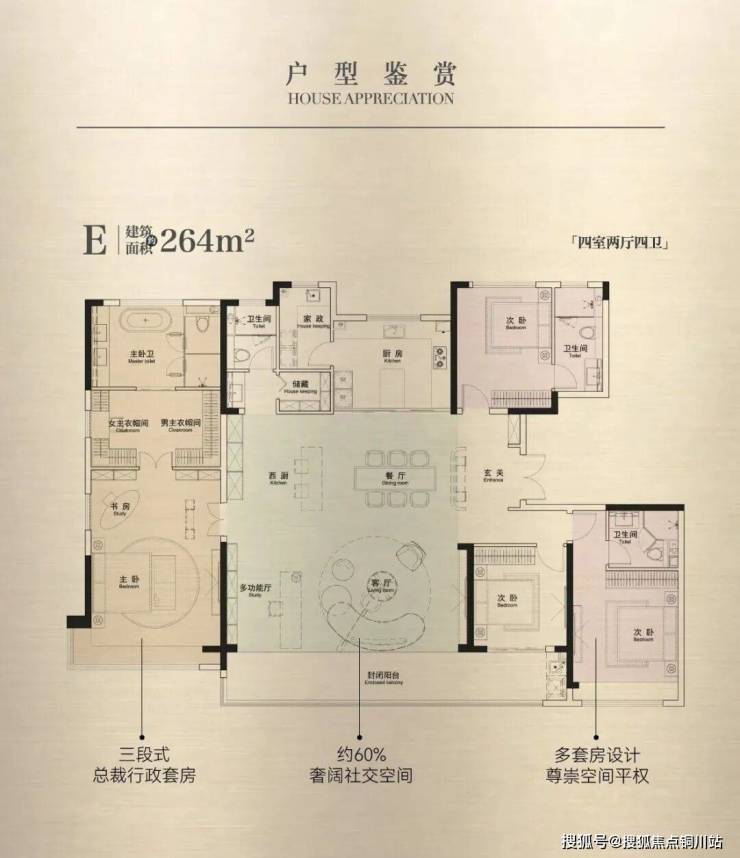 1、定制户型:建面约264㎡户型设计,60%社交空间+40%生活空间,更精准的匹配企业老总日常生活,方便企业家在家宴请亲密的事业伙伴。
