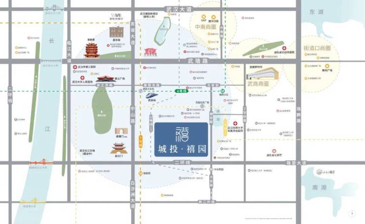 城投·禧园的落位,具体是在武昌区二环,雄楚大街与静安路交叉口西北角。