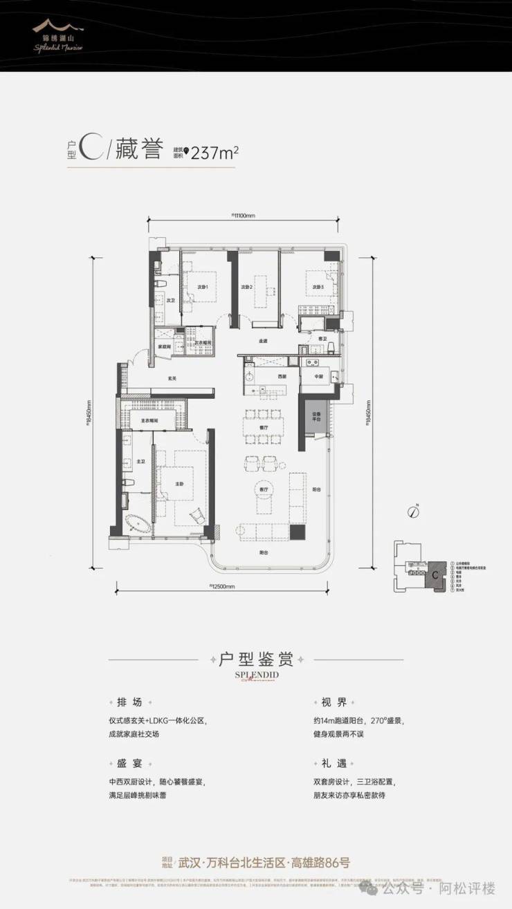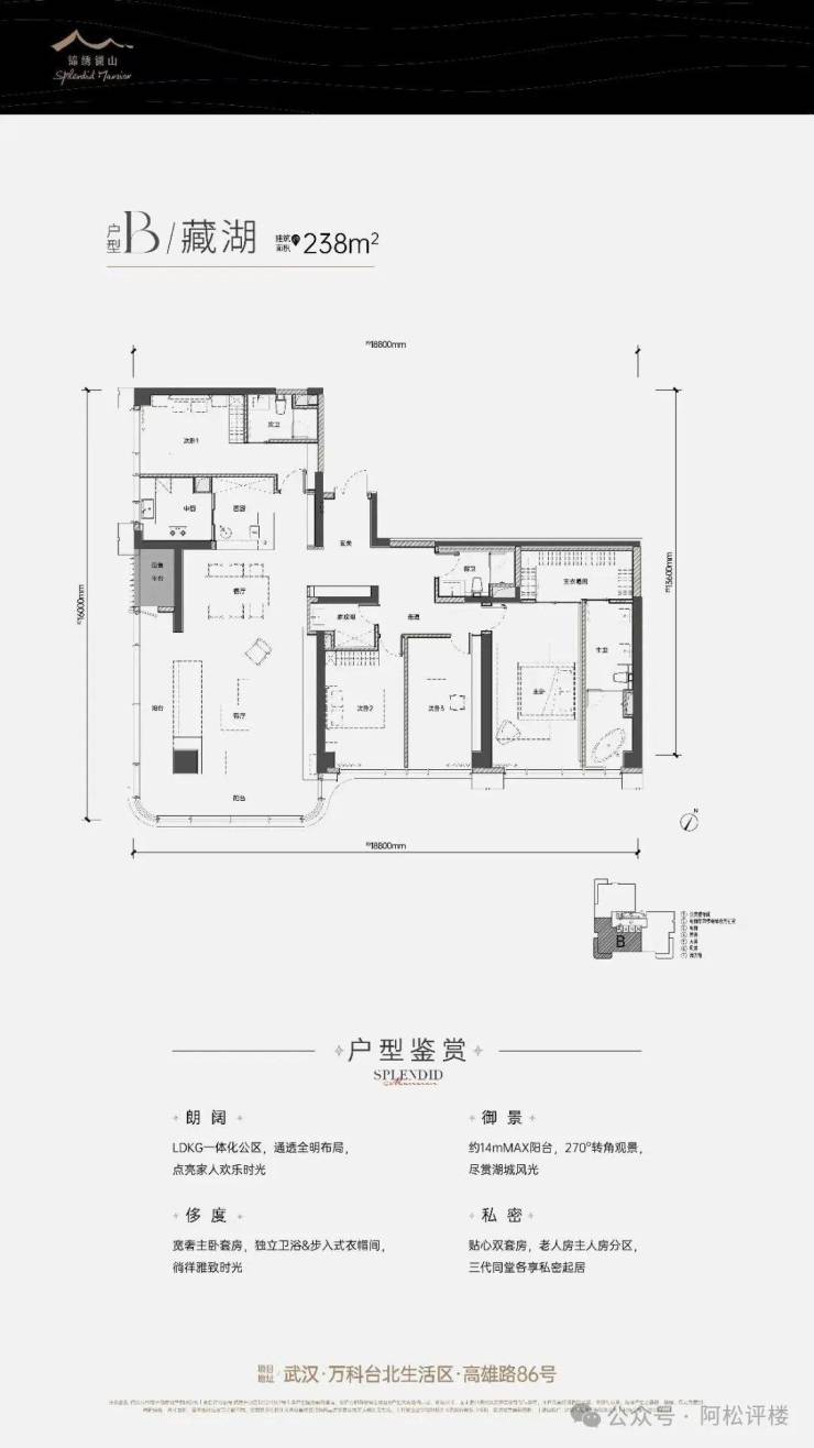 东边端头户型,四室两厅三卫,2开间朝南,3开间朝北,南北通透,双套房设计,约270°转角阳台,客餐厅一体化,中西双厨,配有独立储物间,豪宅气度很足。户型层面来看几乎没什么缺点,硬要挑的话,就是北向次卧有点小,主卧紧邻客厅,动静分区一般。