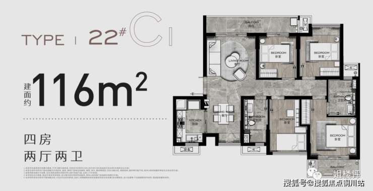 建面约115-116㎡,四室两厅两卫:五开间朝南,做到了四房设计,两个阳台,在三代住宅中,属于功能性很强的户型了。需要注意的是,这个户型所在的楼栋是品字形结构, 虽然该户型是边户,但是会被中间户遮挡。