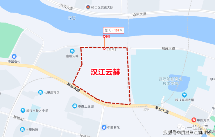 汉江云赫的绝对地理位置还是不错的,位于汉阳区琴台大道与梅家湖路交汇处,位于武汉1.5环,项目距离汉江直线距离也仅约100米,不折不扣的一线临江,周边生态环境也不错。