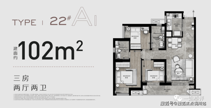 建面约102㎡,三室两厅两卫:三开间朝南的小户型,在老三代楼盘中,这样的面积能做成三房两卫,功能性还是可以,不过北侧次卧以及厨房的采光一般。
