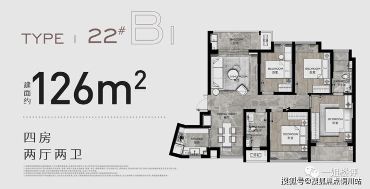 建面约126㎡,四室两厅两卫:该户型与116㎡户型结构比较类似,但该衔接阳台的次卧改为了飘窗,舒适度要高一些。该户型同样存在被中间户遮挡的问题。