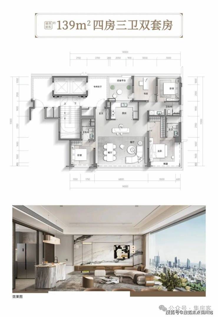 保亿君潮润府139㎡4房3卫户型做到四室三卫的同时室内实际空间使用率高达97%,南向面宽约14米,客厅6.8米南向面宽;连接北侧的书房、北阳台、私家电梯厅,可形成一个可以植入更多生活场景的大洄游动线空间