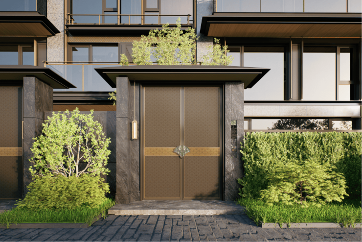 每一户皆是藏品级,门把手以金属精工镶嵌温润的宝格绿奢石,蚀刻着低调而尊贵的LOGO暗纹;雅灰鎏金的高级石材立面,沉稳大气;