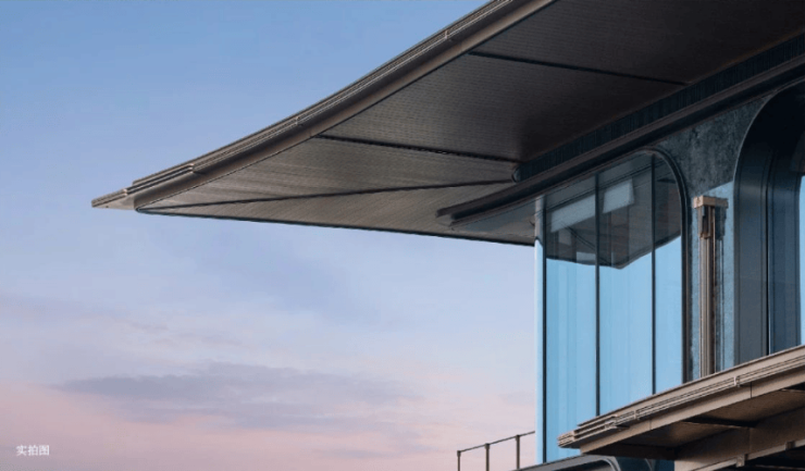 东方美学:建筑立面采用铝板及石材,主体立面以水平线条为框架,融入飞檐、庑殿顶等东方元素,如翼轻盈的飞檐塔冠,挑起一线沙湖的天际脊梁,展现出专属于沙湖的东方美学。