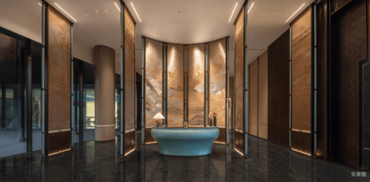 大面积的LOW-E玻璃钻感天幕,让270°的环幕窗景视野,收纳一城峯光。再搭配金色铝板线条,打造镜面感建筑立面,意自东方的气韵与层层描金的典雅,时刻辉映着沙湖如画美景。