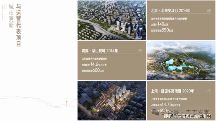 2、中海城市更新标杆案例:上海红旗村(超260亿)、建国东路(近600亿),北京北辛安(超350亿),济南华山珑城(超600亿),实力筑就品质。