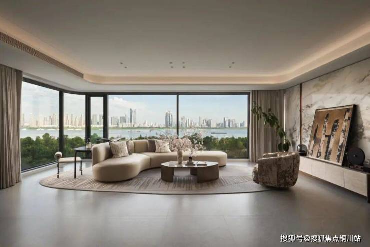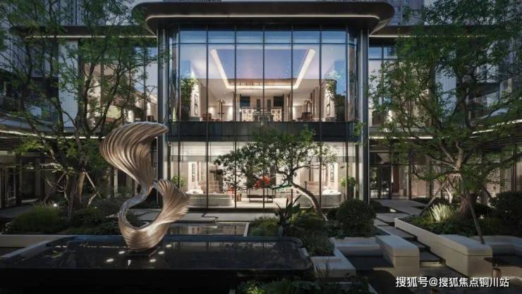 该项目示范区择址垂直于长江的中轴线,以“长江潮涌”为立意,通过艺术门廊、下沉庭院与琉璃光厅等,构筑起一条正对长江的艺术景观轴线,设计将长江的壮阔、里份的烟火与都会的精奢,编织成一幅流动的时光长卷。这里不仅是建筑的集合,更是自然与人文共生的城市会客厅。
