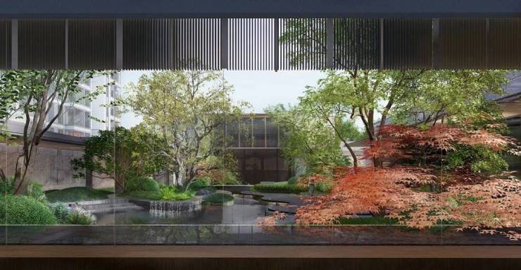 进入大堂之后是一个庭院,庭院之后是中央景观;大堂门仪不再只是简单的大门加大堂,而是用一种度假的东方礼序形成一条景观轴线——既有礼序感又有亲切感,既有大气场又有小温馨,“让回家变得轻松且舒适”。