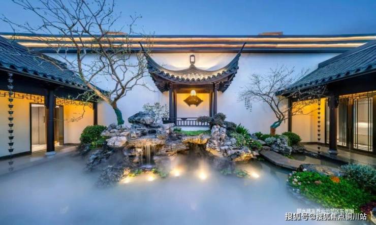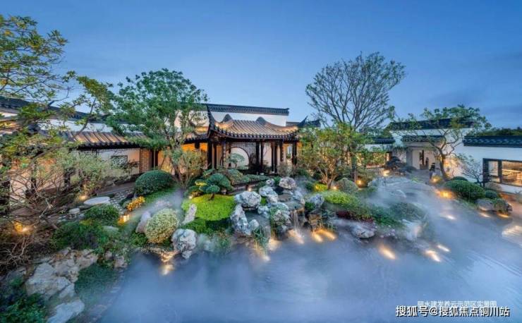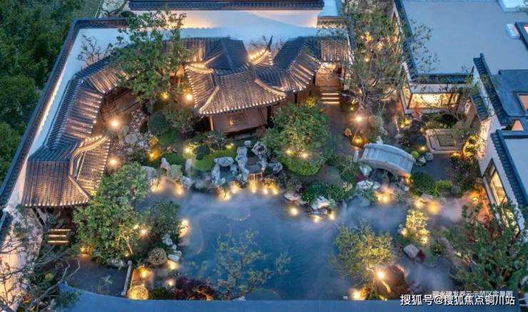 庭院设计方面,追求自然与人文的完美结合,应用中国古典园林“园中园”的设计概念,呈“囬”字形园林布局,院落中叠石成山、引水成池,取亭楼桥,曲径通幽,营造出一种宁静、优雅的氛围,打造家庭成员交流、休息的公共生活空间。