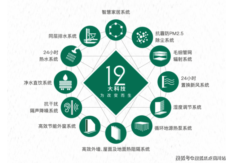 从“温度、湿度、空气、阳光、噪音、水”六大基本生命元素出发,在室内温湿度、空气质量、节点做法等进行多方面迭代提升,通过焕新升级的12大科技系统(包括地源热泵系统、毛细管网系统、24小时全置换新风系统、抗霾PM2.5系统、湿度调节系统、LOW-E节能外窗系统、高效外墙屋顶地面保温系统、隔音降噪系统、同层排水系统、净水处理系统、24小时热水系统、智慧家居)为居者营造“衡温、衡氧、衡洁、衡湿、衡静”五衡居住环境,满足高净值人群对于绿色科技奢宅的极致体验。