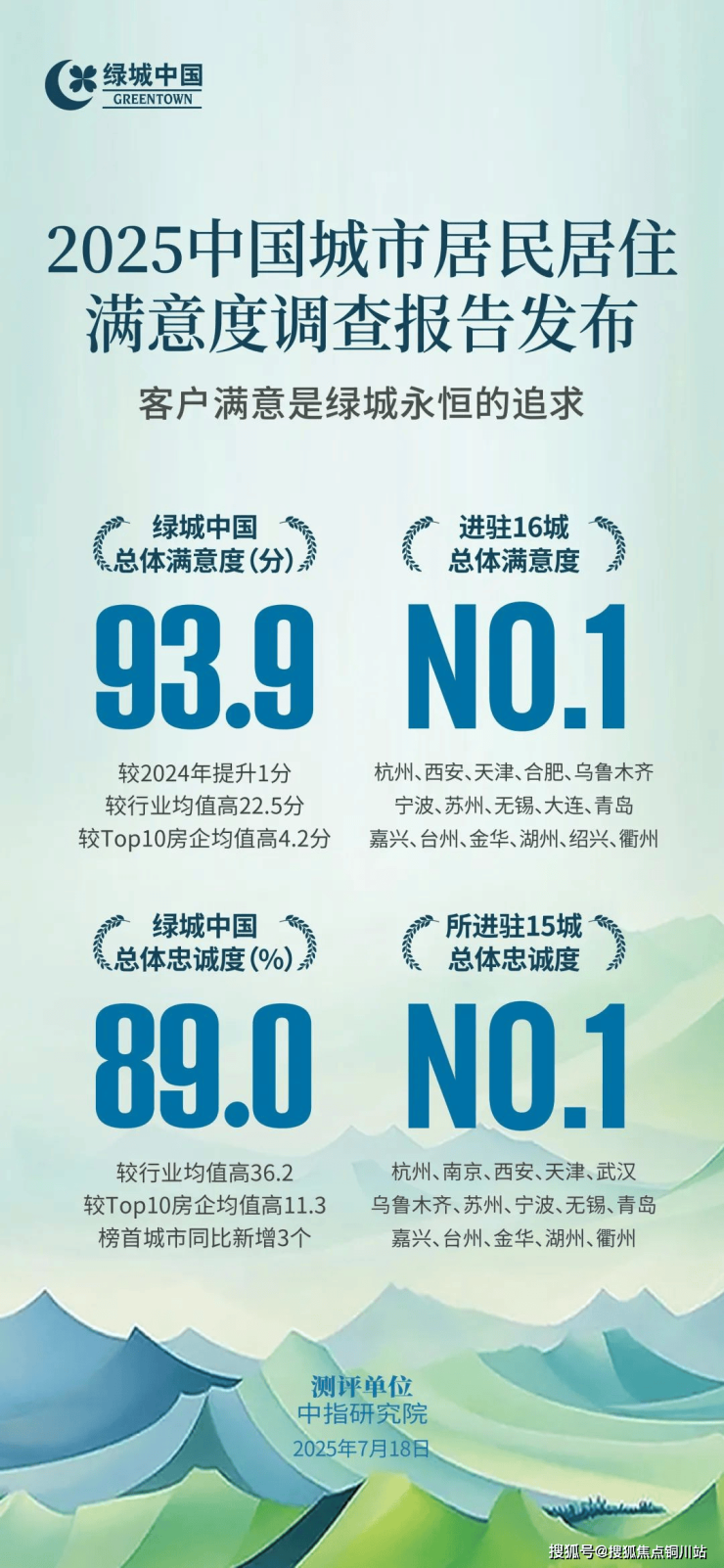 近日,中指研究院发布《2025年中国城市居民居住满意度调查报告》,绿城中国总体满意度得分93.9分,较去年提升1分,在所进驻的16座城市拿下总体满意度第一。总体忠诚度得分89.0分,在进驻的15座城市获总体忠诚度第一位,较去年新增3城,持续领跑行业。