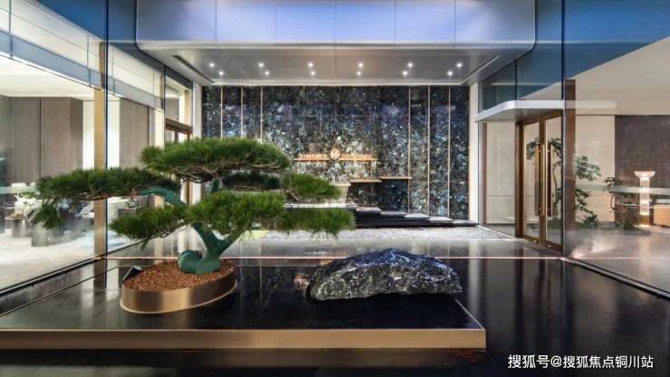 以奇松、怪石、水台、叠瀑、景墙精心构建,三面皆是玻璃幕墙,庭院本身就成为室内最好的景观。