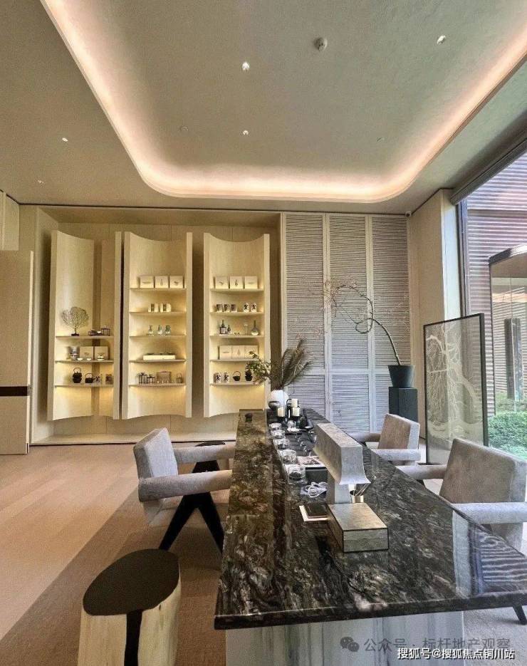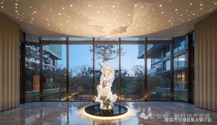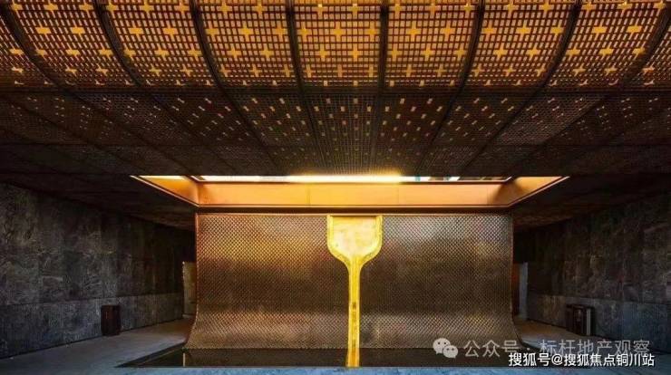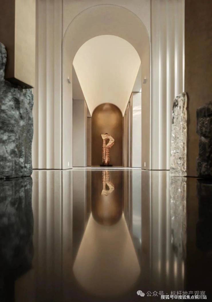 沉浸东方雅韵,唤醒古制新光——北龙湖首筑约300米地下环岛车马迎宾前厅,以沉香石材之奢华,融仿铜不锈钢之现代艺术,共绘墙面璀璨画卷,演绎当代东方礼制的极致新生。