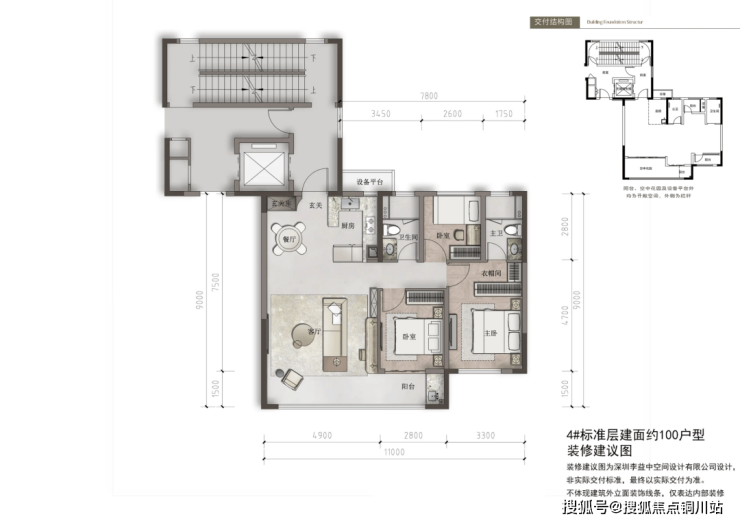 以4号楼建面约100㎡户型为例,空间尺度即使与传统住宅建面约125㎡户型相比都不遑多让。