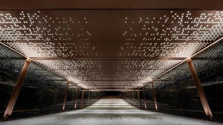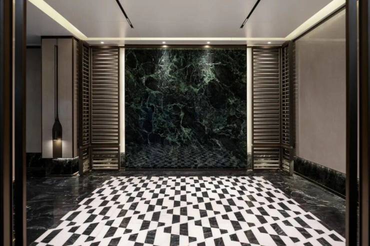 约6米高的车库入口+爱马仕黑廊柱+鎏金金属格栅,一路琉光、优雅奢华;地下大堂光厅入户,一层大堂对标国际级奢华酒店,气派恢弘的同时与世界无缝衔接。