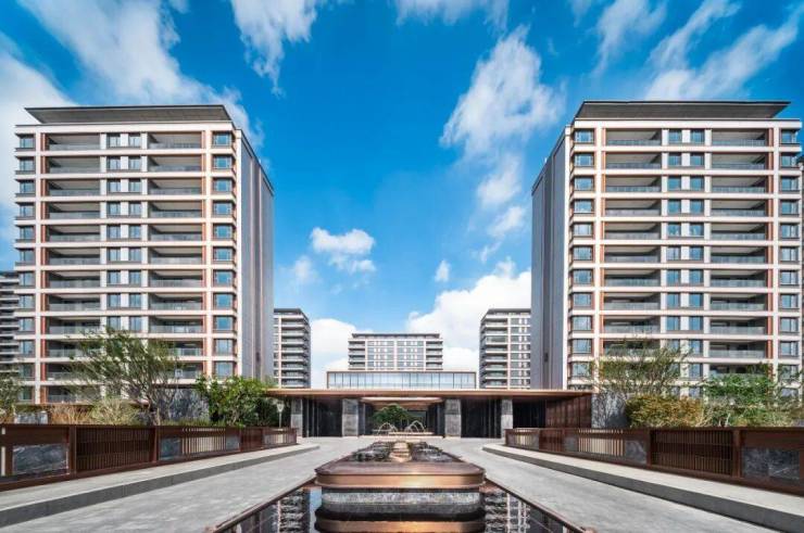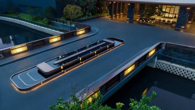 在归家仪式上,取法寄畅园渡河而归的七韵桥,加上约47米超尺度酒店式环岛落客区,以及价值不菲的巨型迎客松、爱马仕奢石等,铺陈出奢侈品级的归家空间。