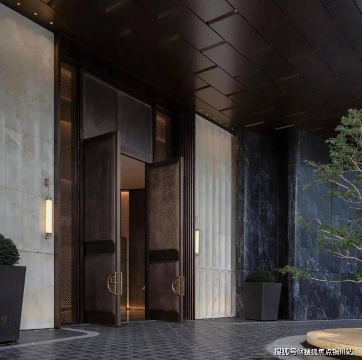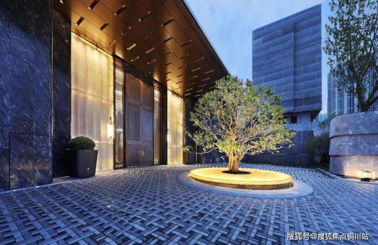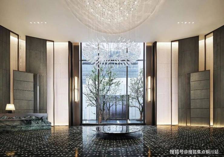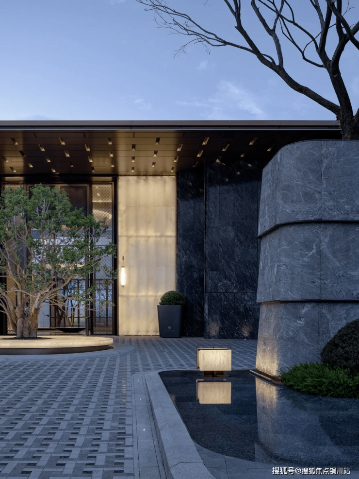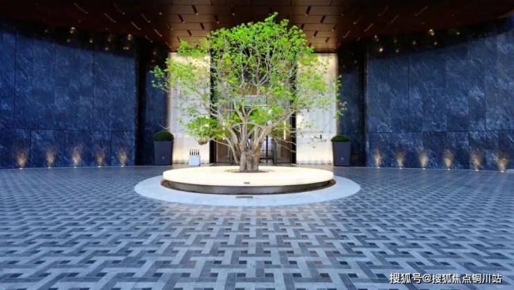 保利·海晏天珺是用室内思维来做户外景观。走进门厅,你会发现他们同样也是用室内思维来做公区设计:大堂地面的玉石铺装,也是编织艺术;地下的下沉式庭院入口的地面玉石铺装,灵感来自宁波当地的「竹编」与「天一阁」窗花元素。