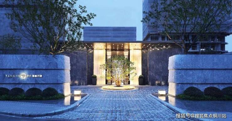 社区主大门采用对称式的八字环抱式盈门,高9米、宽30米,搭配7米超高悬挑雨棚实现酒店式无雨落客,形成壮丽饱满的"名门之仪",给人一种安定丰盈的归家感动。