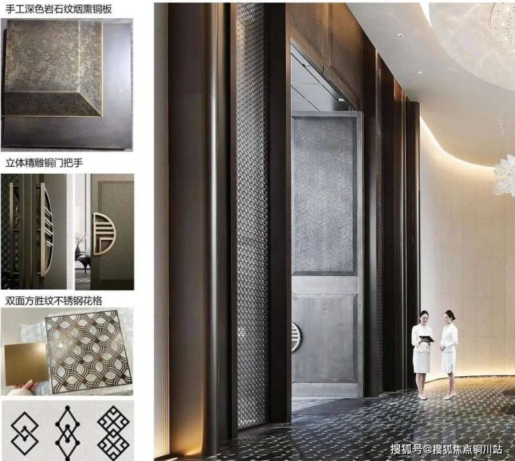 铜门两侧设有镶嵌天珺纹样“方胜纹”的艺术玻璃,寓意有同心同德、同舟共济,处处流露出匠心。
