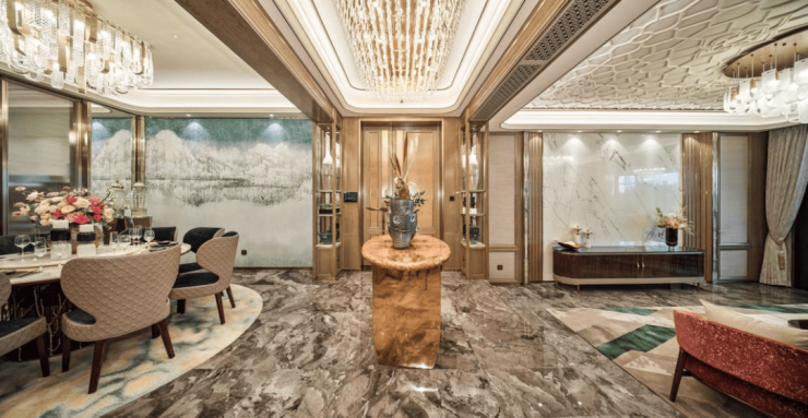 以半岛五號为例,采用煜丰实业定制的「双曲面拼花木作」工艺,实现2000㎡大堂木饰面拼接缝隙≤0.3mm,又如太原星河湾,石材拼花采用航天激光定位技术,每平米精准镶嵌238块玛瑙,实现"发丝级"密拼。