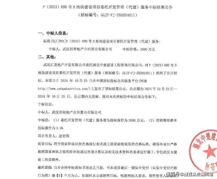 2025年10月28日,武汉招商地产古田置业有限公司中标了光谷P(2023)090号B地块建设项目委托开发管理(代建)服务,中标价格2690万,营销费率3.50%。