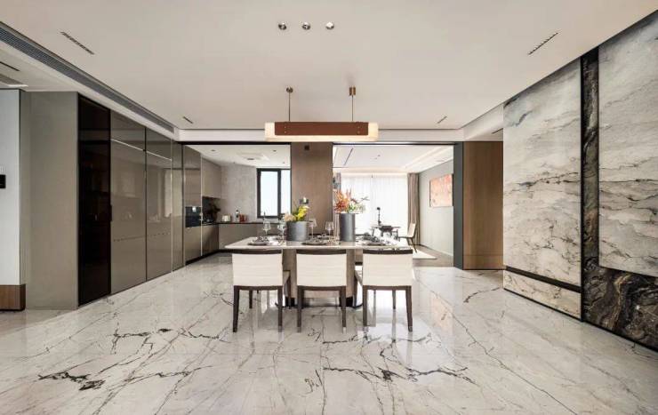 这里虽是一座巨厅,但餐厅是相对独立的,摆得下大圆桌。这一点,就连B新盘的建筑面积约170㎡都做不到,天樾玺却用更小的面积做到了。