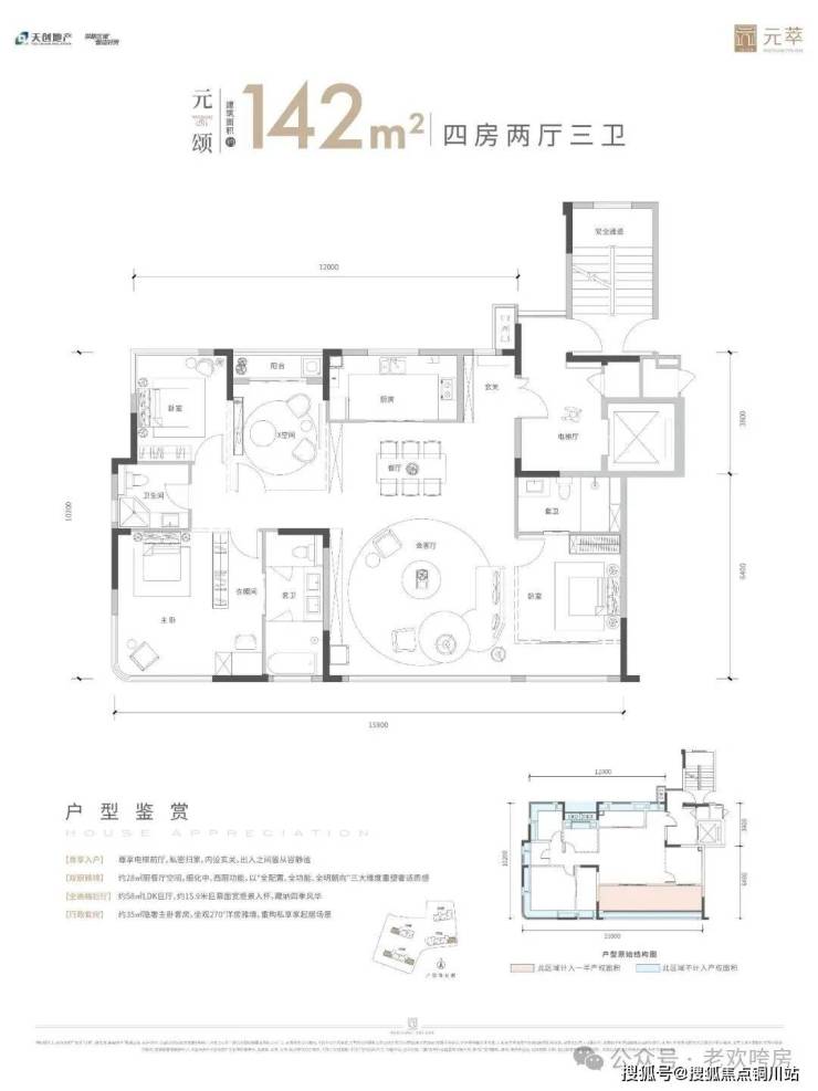 建面约142㎡四房两厅三卫的边户,南向面宽达15.9米,双套房设计,客厅与双套房均朝南,近60㎡LDK一体化大客厅,主卧套带270°转角窗,观景视野佳;北向的生活阳台,实现晾晒、储物功能分区,居家动线更合理。