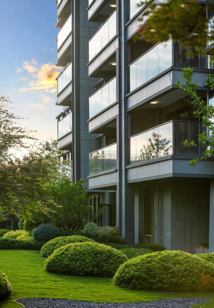 沿着归家动线前行,现代风格的建筑立面令人眼前一亮。灰色主色调营造出清新、典雅的氛围,简洁大气的线条搭配大面积玻璃,勾勒出灵动的城市天际线,展现出独有的美学魅力。