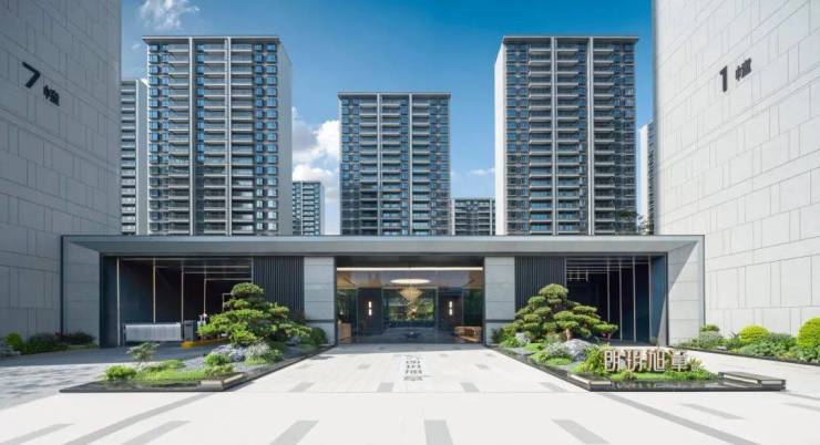 宽约 30 米的入户大门尽显恢弘,以高尚酒店式标准精心打造,外部墙面采用干挂石材,搭配铝板格栅与铝合金线条,在阳光的轻抚下熠熠生辉。大门两侧,两棵数十年树龄的迎客松傲然挺立,它们采用全冠移植技术运输、栽种并悉心养护,多次调试的栽种角度,让其雄浑苍劲的姿态得以完美呈现,如同忠诚的卫士,恭迎着业主回家。