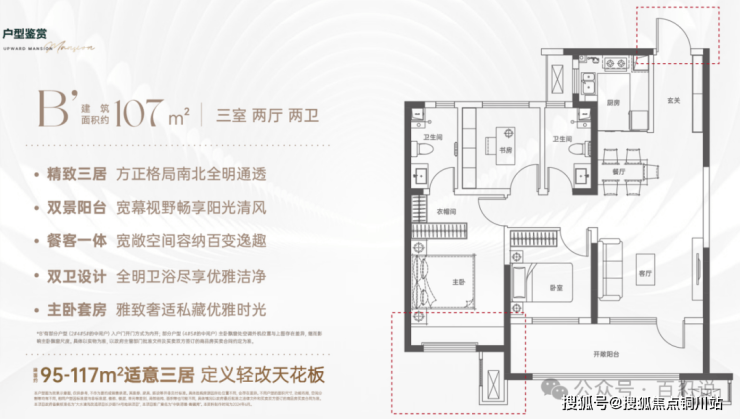 107和120平的大小两种三室两厅两卫户型,具有不同的门槛和空间组合,也是根据不同的家庭需求,是二胎家庭还是三代同住?未来自己装修的时候,可以自己根据家庭情况来充分调整,是做老人房还是儿童房?这样就做到了定制化和人性化。