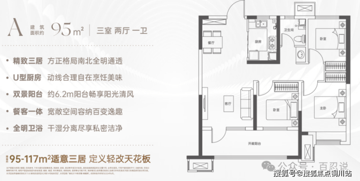 95平米的三室两厅一卫户型,南向双阳台,空间十分通透,客厅开间3.4米,客餐一体,各个功能非常齐全,满足生活需求。