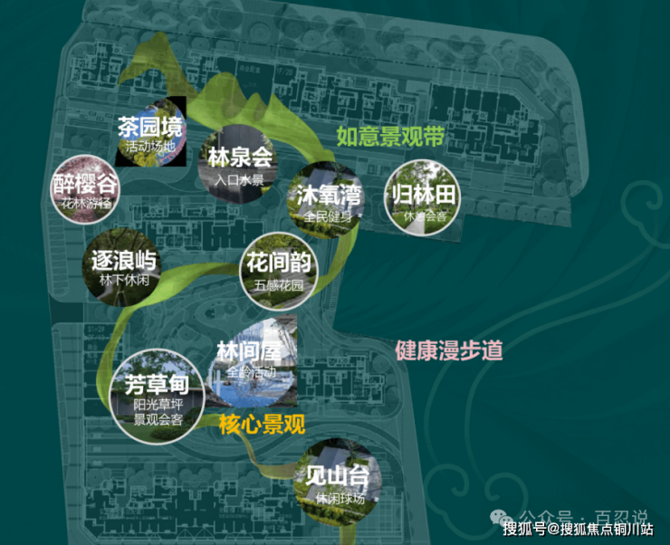 根据规划,青樾湾项目内部有如意型景观带、核心景观区和花谷健康漫步道组成的“一带一心一环”之外,还有全民健身区、五感花园组团、松果主题儿童游乐区、阳光草坪、景观会客厅等十大生活场景,形成了一个慢生活的全龄景观园林。